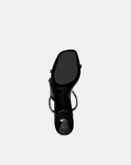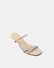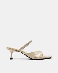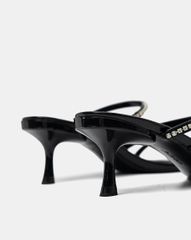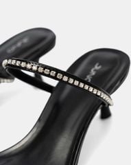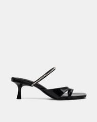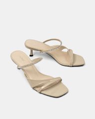 Giày mũi vuông, quai mảnh đan chéo đính đá mang lại nét nổi bật khi diện